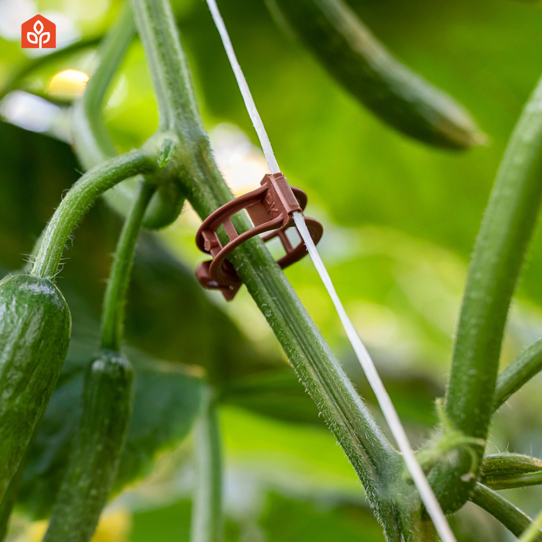 Specially designed for staked cucumbers, this biodegradable clip ensures a secure connection of the cucumber plant to the raffia.
